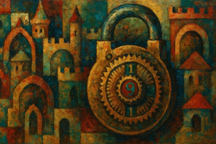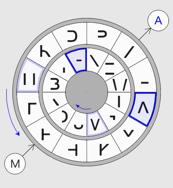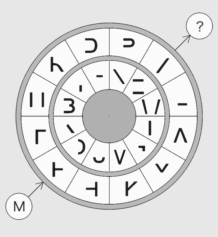 助言に従い外側と内側の記号を組み合わせてみたところ、「M」になるペアを見つけた。そこで、ダイヤルを回してそれらが隣り合うようにしてみると、反対側に並んだペアでできる「A」が右上に表示され、無事解錠することができた。
